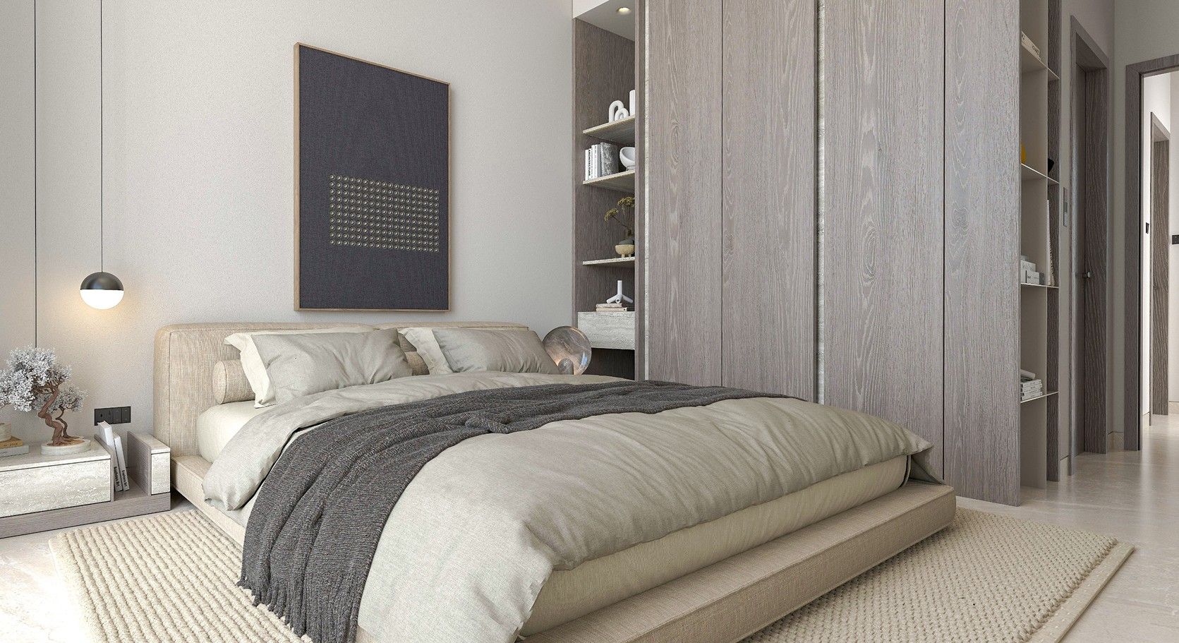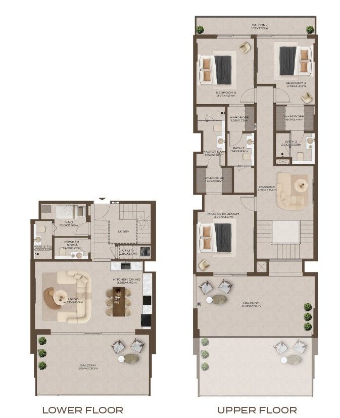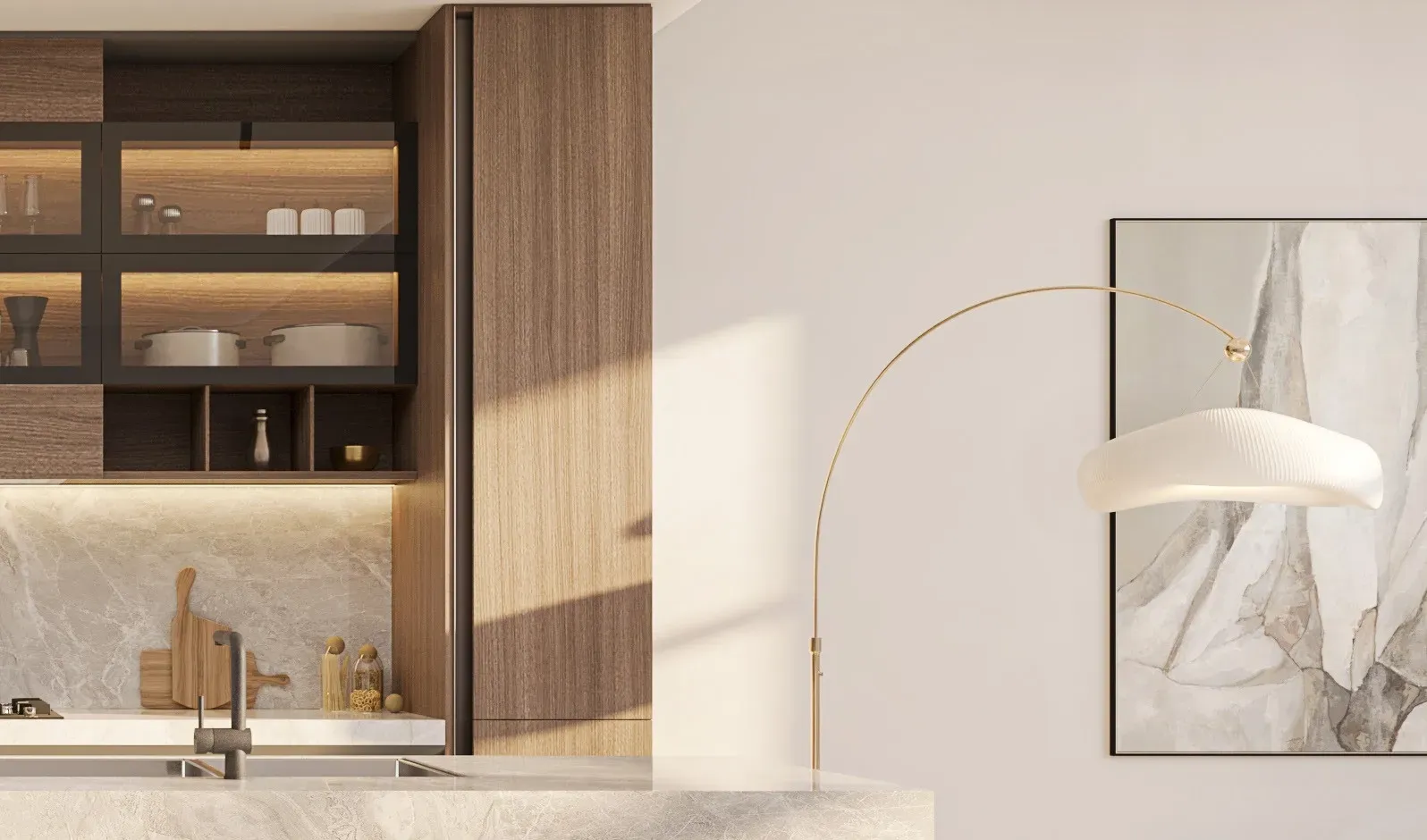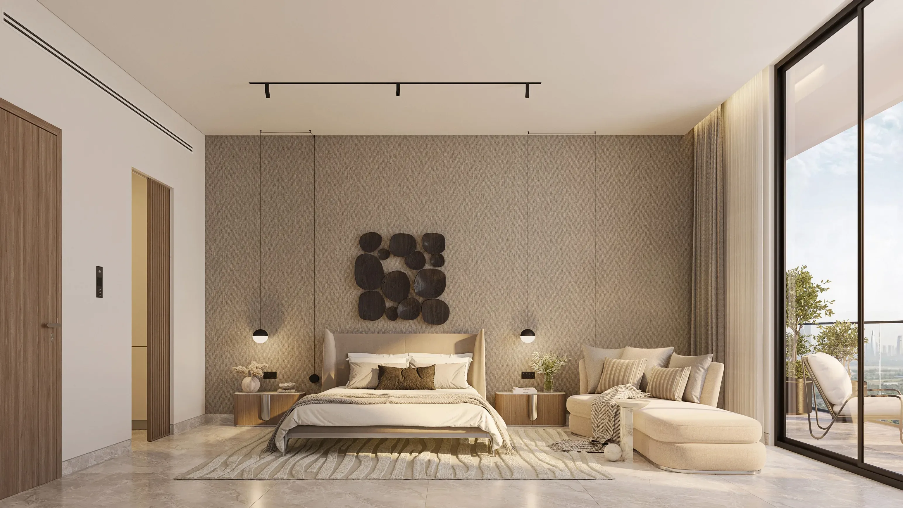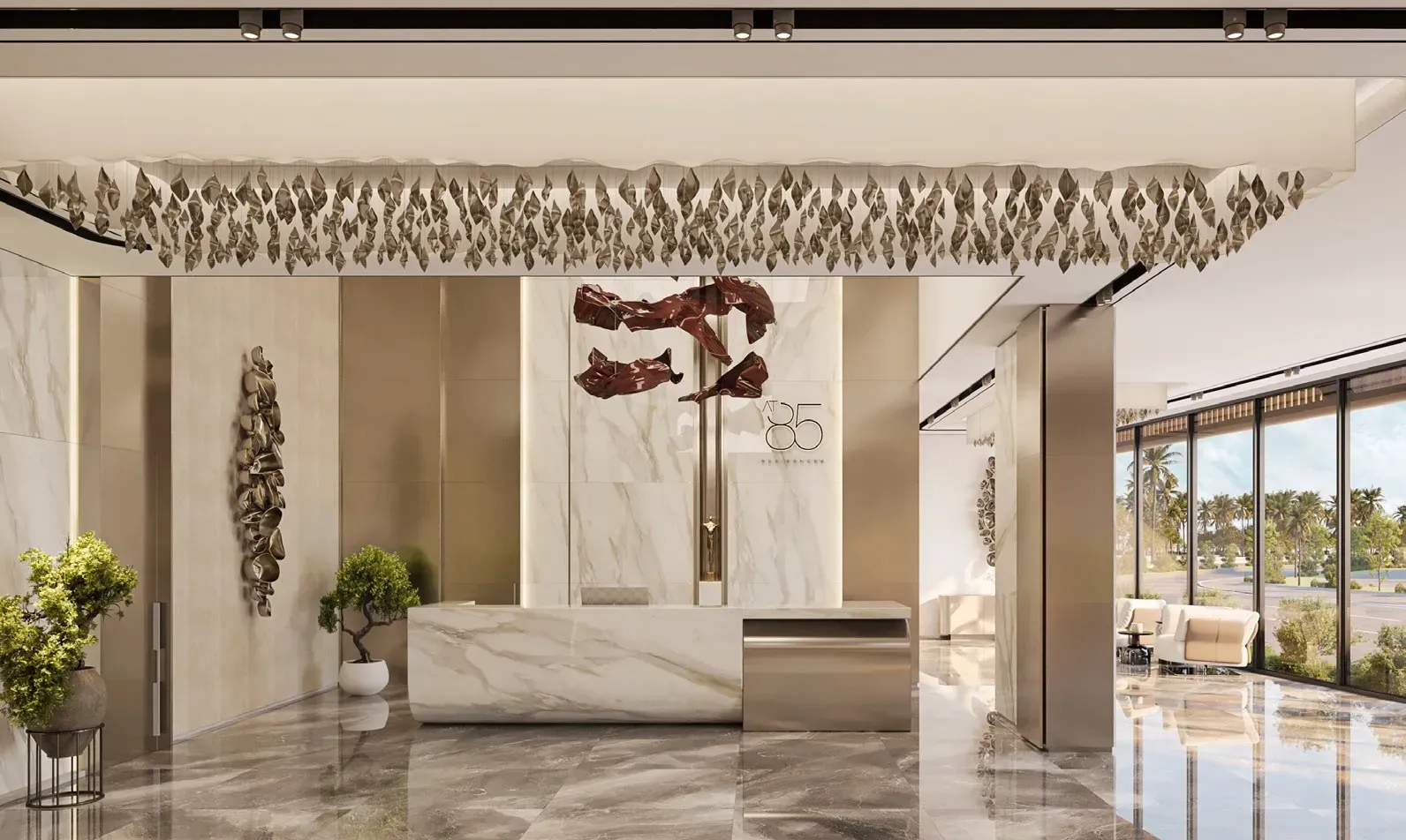 Interiors feature marble finishes, wood detailing, full-height glazing, and clear zoning between living and private areas.