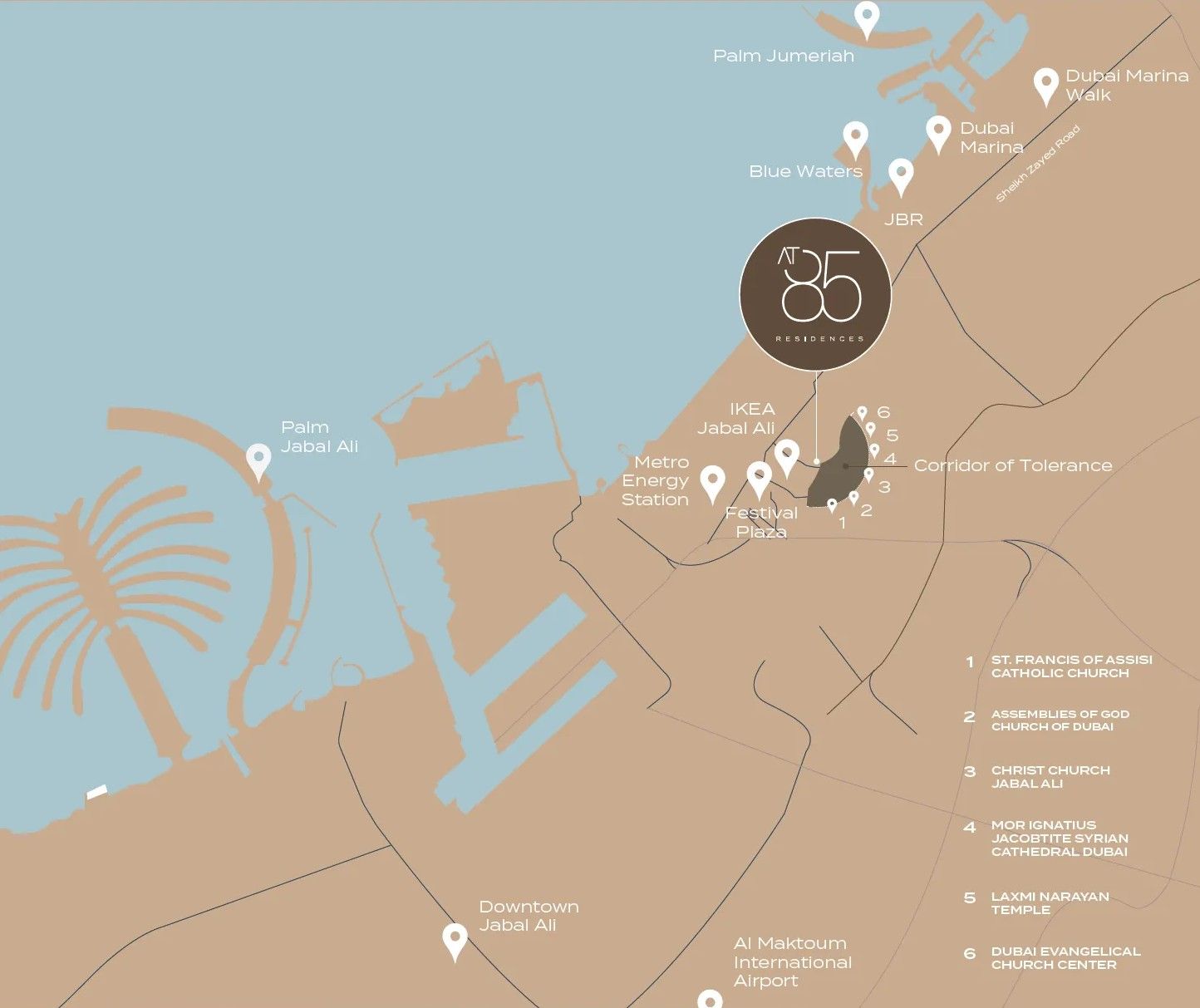 AT85 Residences is located in Wasl Gate, Jebel Ali, Dubai, just steps from Energy Metro Station and with direct access to Sheikh Zayed Road. The address places residents within minutes of major destinations including Festival Plaza, IKEA, Dubai Marina, and key business districts across the city.