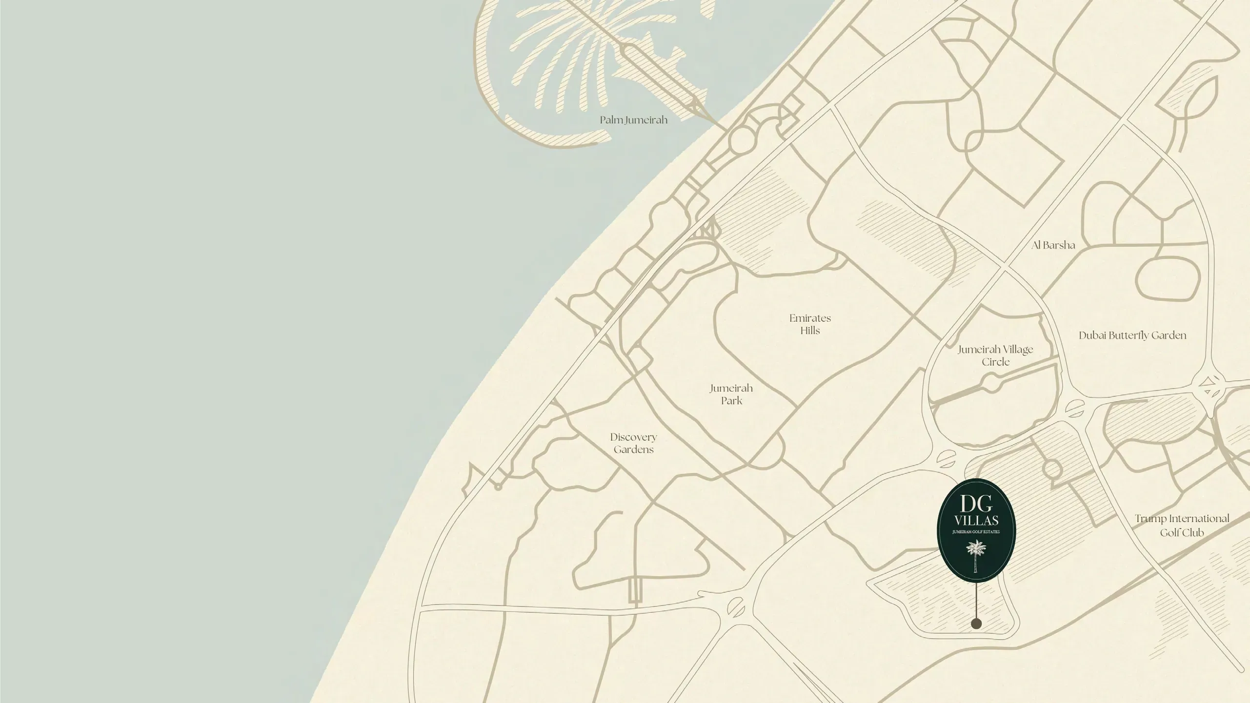 D-Villas is located within Jumeirah Golf Estates in Dubai, UAE. The community offers excellent connectivity — approximately 8 minutes to Al Khail Road, 15 minutes to Sheikh Zayed Road, 25 minutes to Downtown Dubai, 23 minutes to Dubai Marina, and 20 minutes to Palm Jumeirah. The location combines tranquil golf-course surroundings with easy access to key city landmarks.