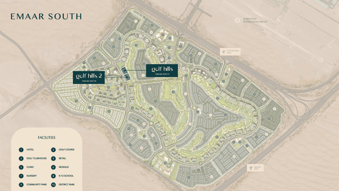 Emaar Golf Hills is considered a strong investment choice due to its strategic location in Emaar South and its integration within a growing development corridor anchored by Al Maktoum International Airport and Expo City. The project’s proximity to key Dubai destinations, along with extensive community amenities such as golf-course landscapes, fitness facilities, children’s areas, and integrated retail and education infrastructure, supports long-term desirability for both residents and future buyers.