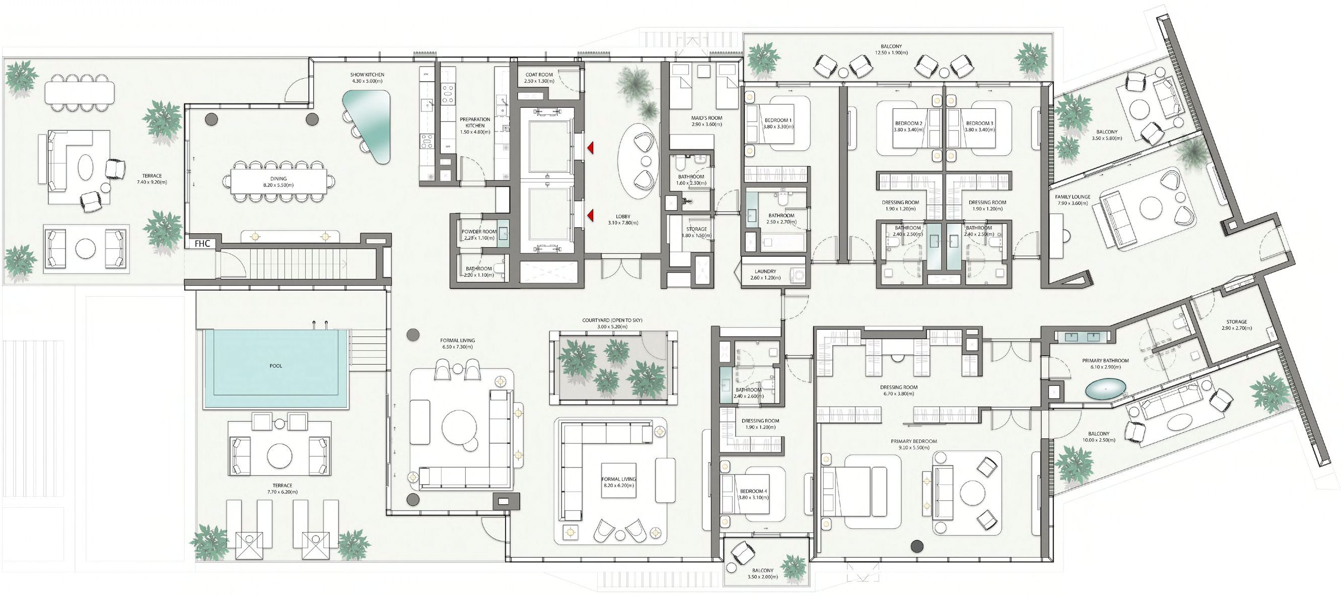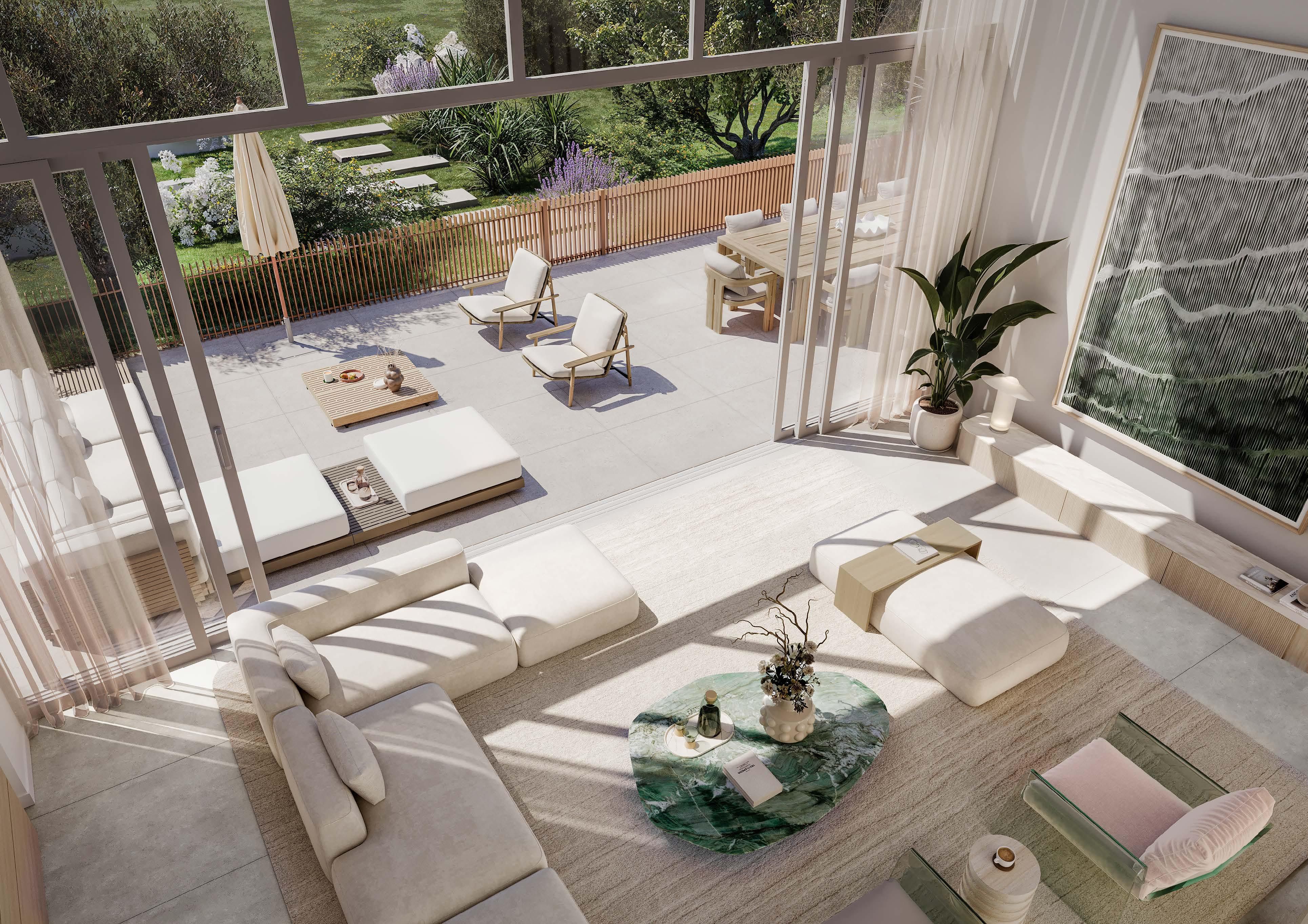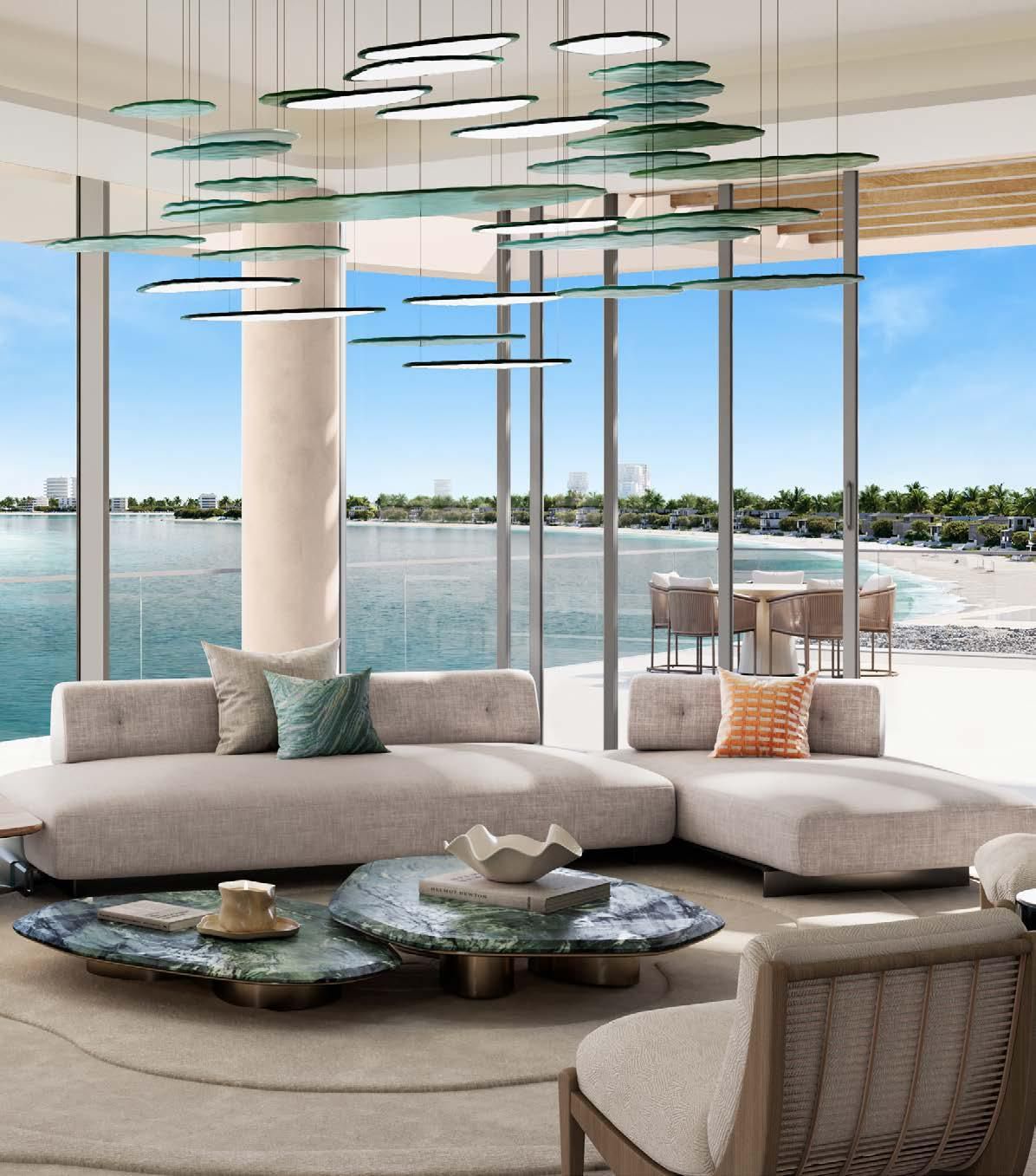 Residences range from apartments to townhouses and penthouses, featuring open-plan layouts, floor-to-ceiling glazing, and private terraces or balconies. Select ground-floor homes open directly to landscaped decks and the beach, while upper-level residences enjoy expansive terraces and panoramic sea views.